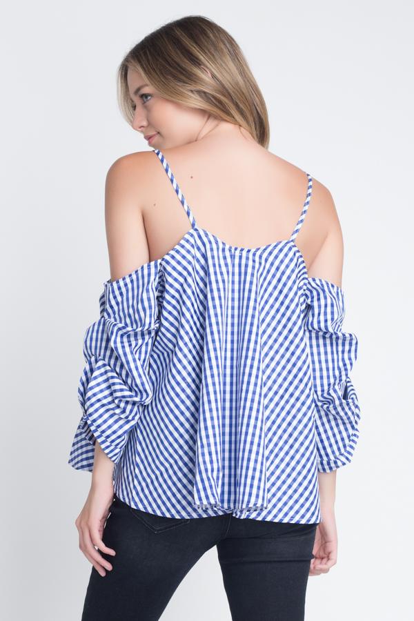 This top features a cold shoulder style and checkered print.