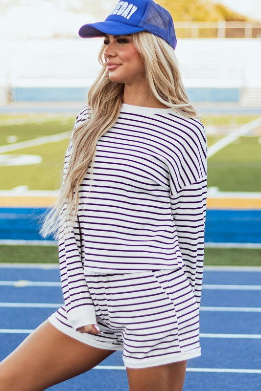 This adorable set adds flair and flexibility to any outfit. Upgrade your fashion game with fashionable stripes. The unique fabric adds dimension and catches the eye. Plus, the high-rise shorts have convenient pockets on the side.