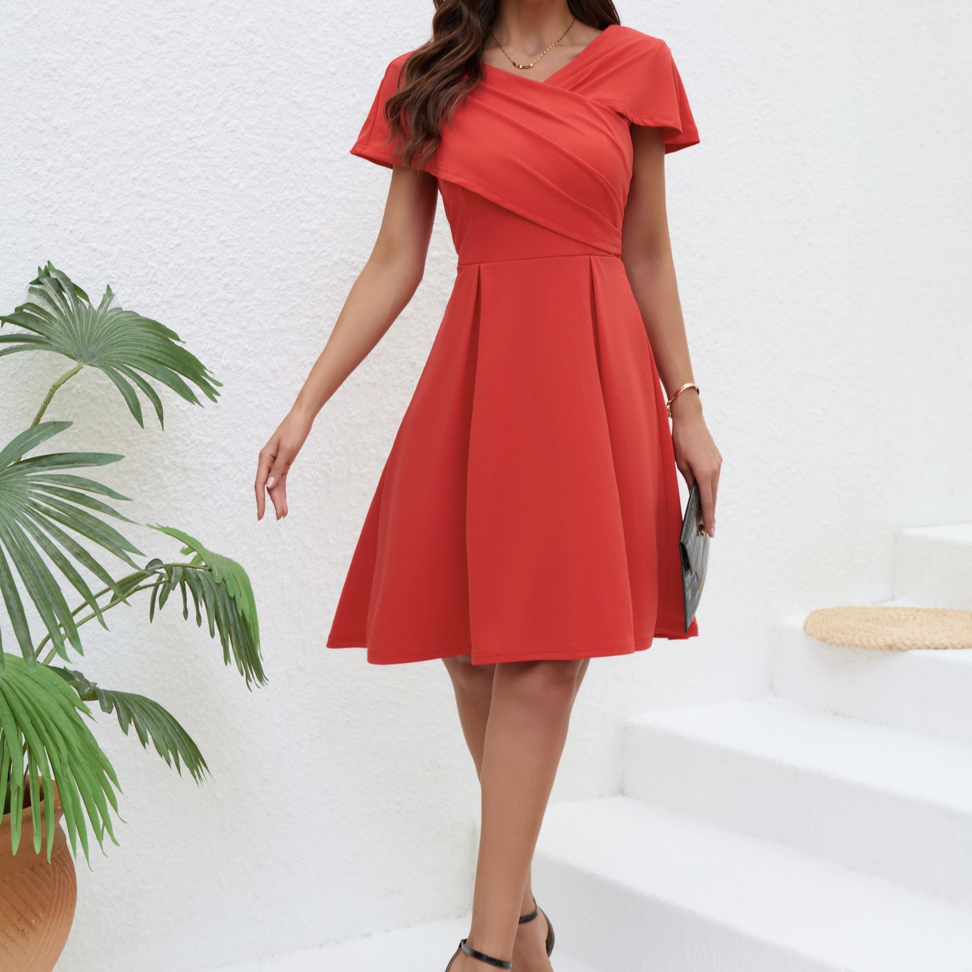 Women Solid Color V-Neck Slim Waist A-Line Dress