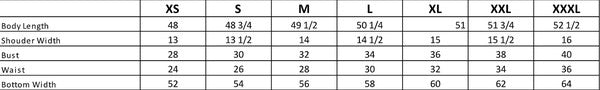 XS: (Bust), (Waist), (Hips), (Length)
